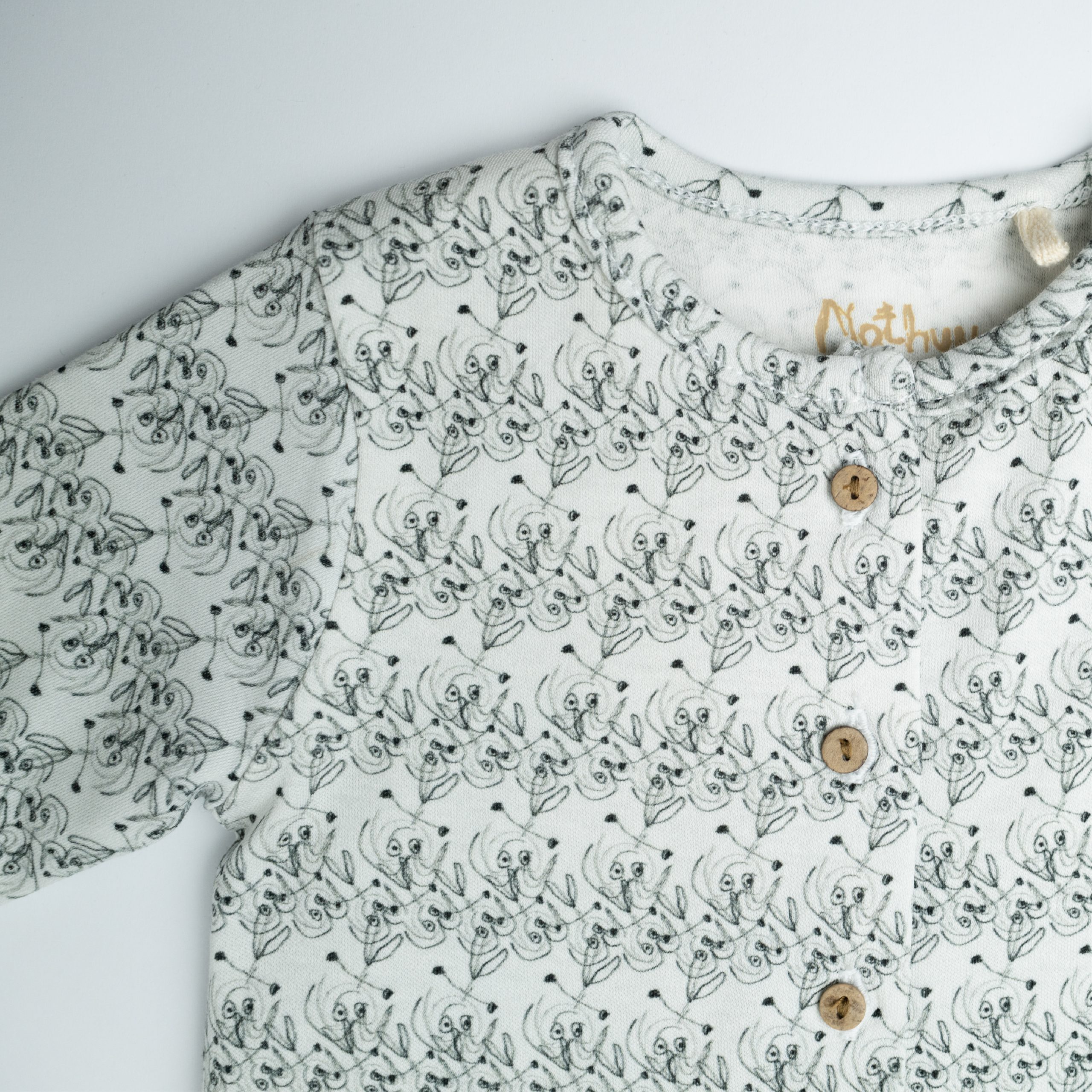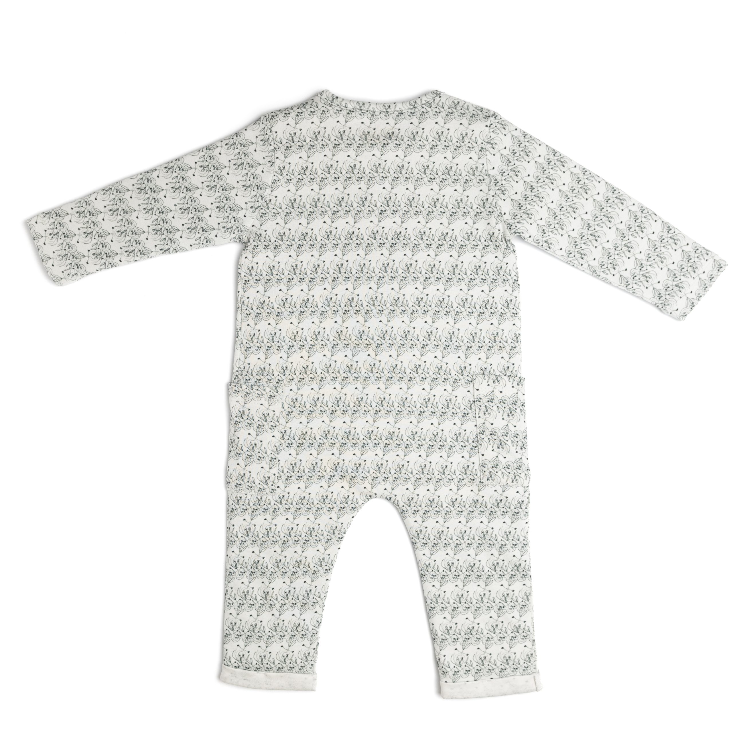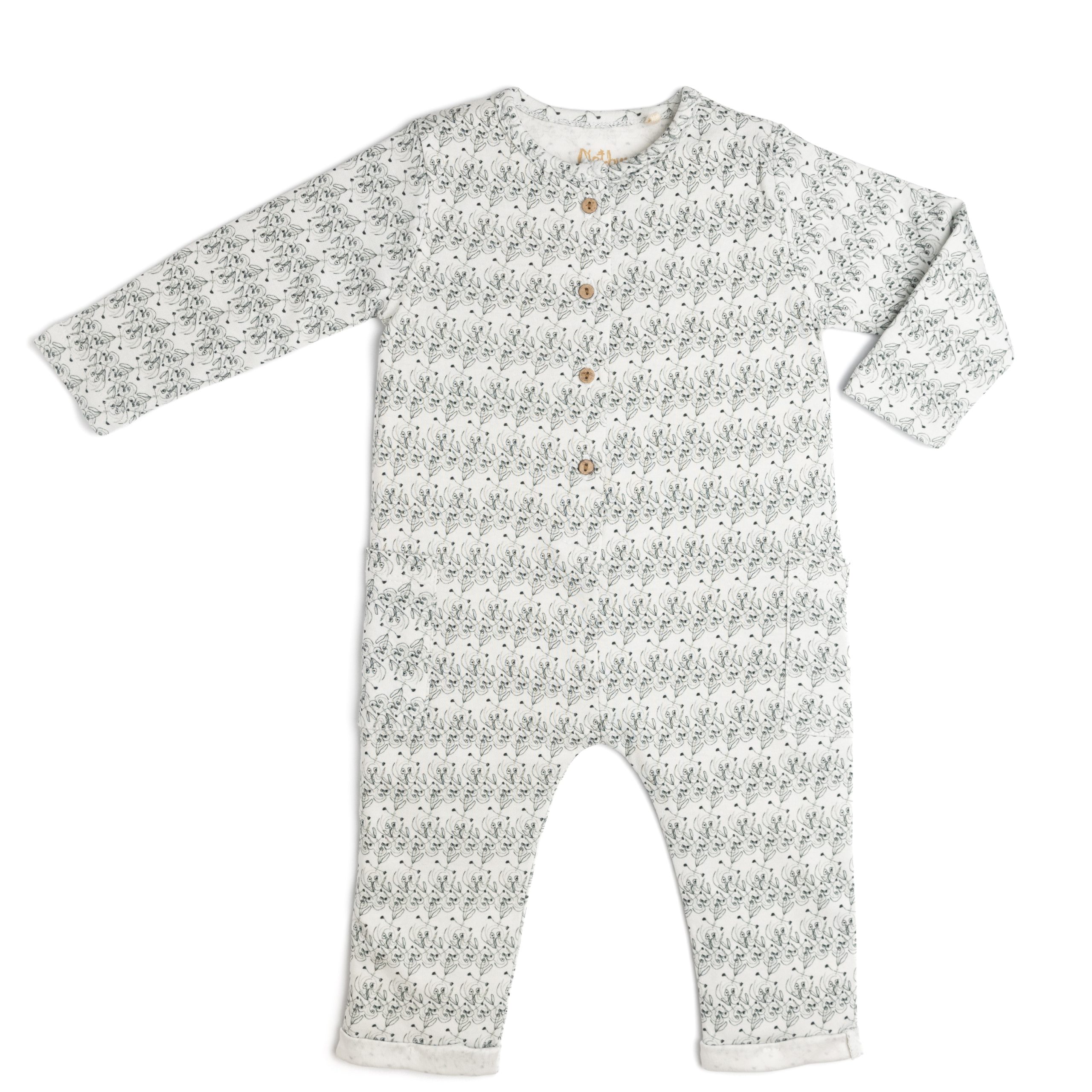 Romper suit in super-soft double- weave, patterned organic cotton with a button placket and two side-front pockets. Full sleeves and full legs; sewn-in turn-ups.