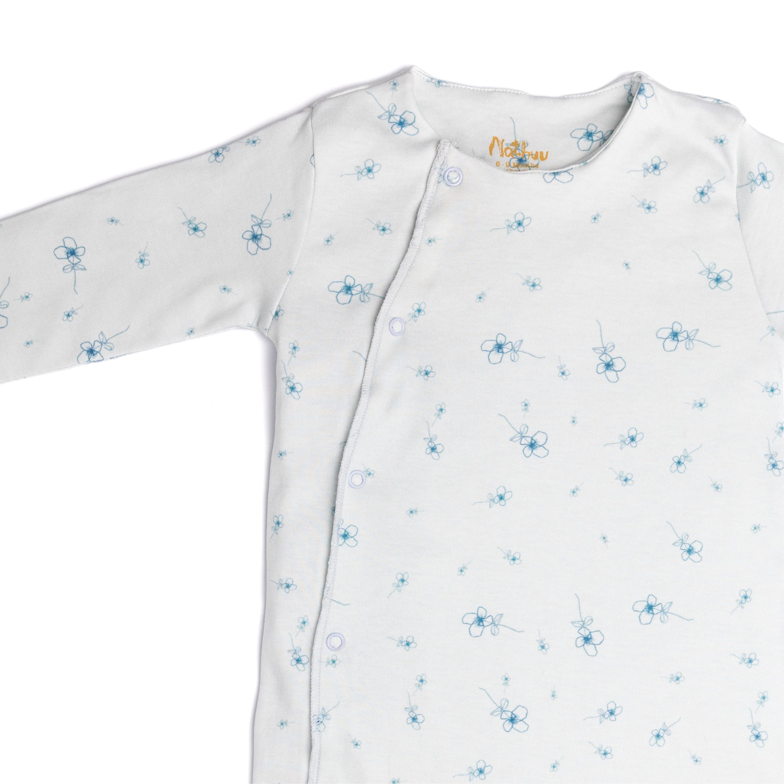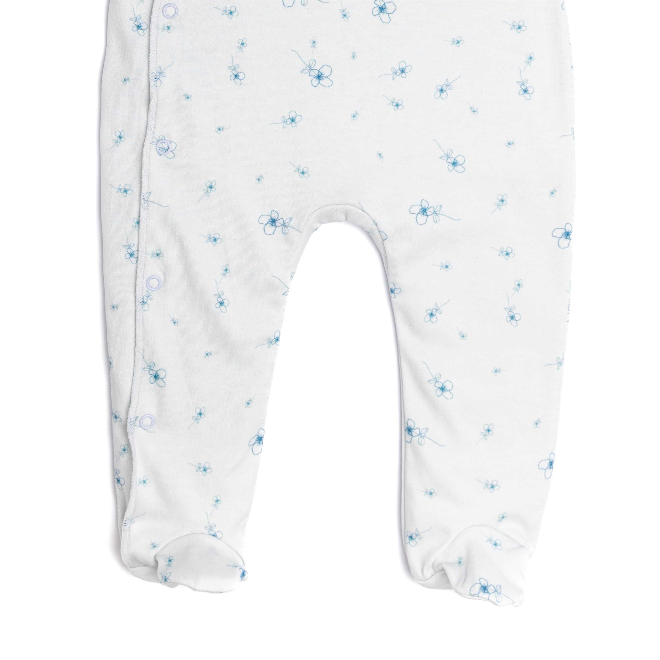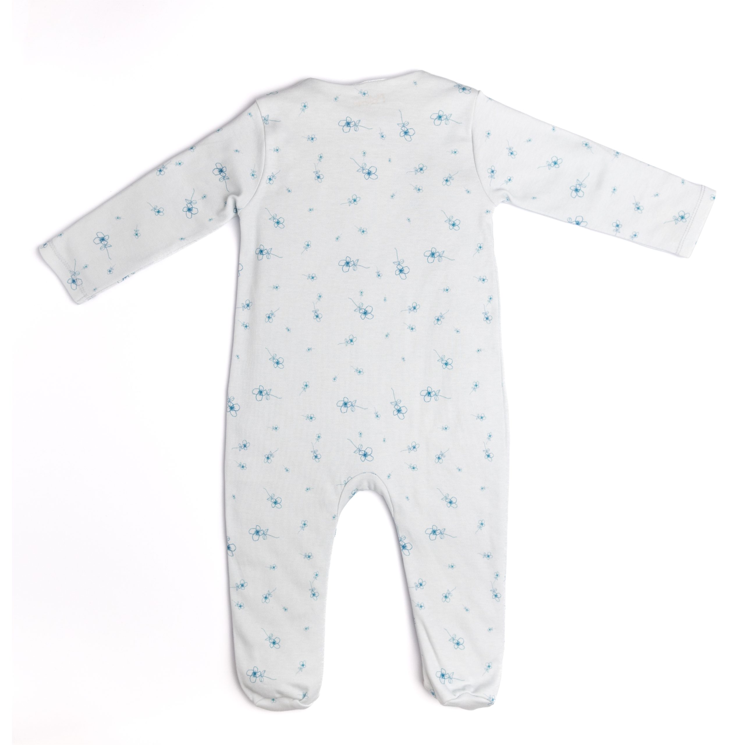 All in one; full footed pajamas in super-soft double- weave, patterned organic cotton jersey. Wrap-over front, press-studs down one side finished with long cuffed sleeves.